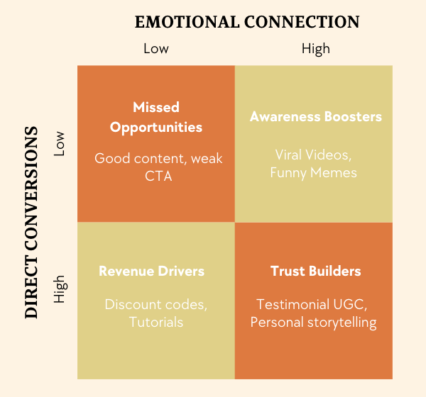 My experiences creating performance-driven social media content for a wide range of brands, has led to me developing my own 2x2 matrix for Audience Connection vs. Conversion Matrix. It helps us think about what types of content actually work for our audience and for our goals.